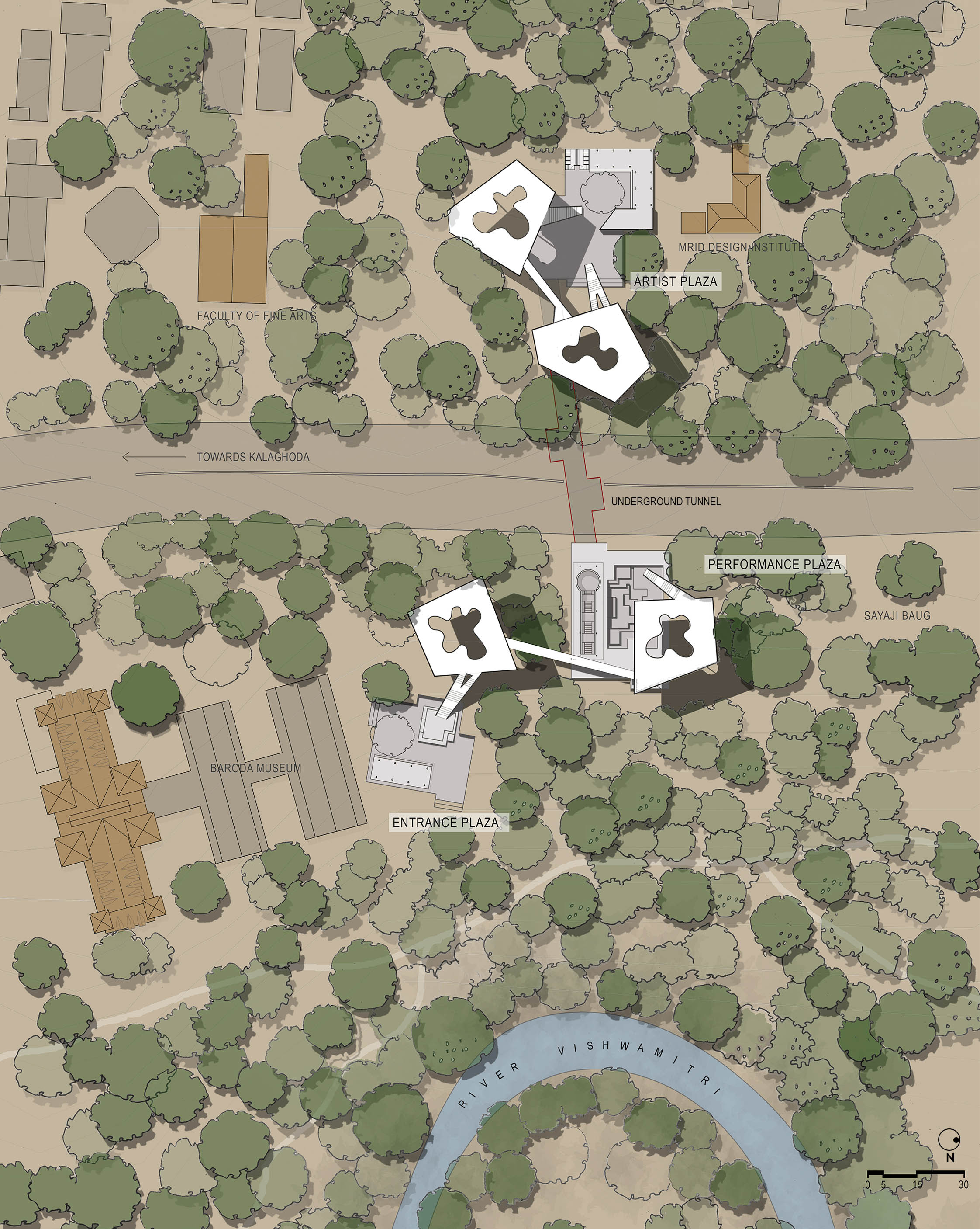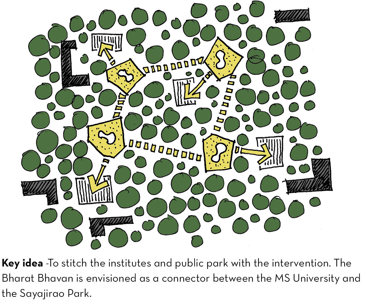 The idea is to imagine a new kind of institutional setting. Gone are the days when the government will allocate a parcel of land for a stand alone cultural institution. We will have to locate and link them with existing socio-cultural objects. The new Bharat Bhavan will hover over and around an existing garden, a museum and a fine arts college in the process bridging these institutions as well. Sometimes you need an anonymous stranger (an alien) to bring people together!
